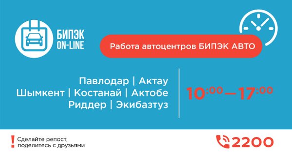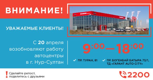 Уважаемые клиенты! 20.04 открываются автоцентры в городе Нур-Султан, по адресам пр. Туран, 81, пр. Богенбай батыра 73/1, ТД «Гарант Auto City». Режим работы с 09:00 до 18:00. В целях соблюдения санитарно – эпидемиологических мер, советуем перед посещением автоцентра предварительно записаться по номеру телефона: 22 00 Call – центр Бипэк Авто. Мы работаем для вас!