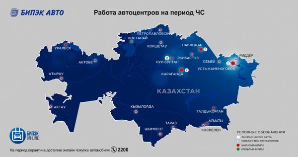 Уважаемые клиенты! Автоцентры в городах Актау, Риддер, Шымкент, Костанай, Актобе, Павлодар и Экибастуз работают по графику: с 10:00 до 17:00. Автоцентры в других городах Казахстана временно закрыты. Так же вы можете получить консультацию о покупке автомобиля, сервисному обслуживанию и других услугах, по номеру телефона 22 00, либо на нашем сайте Мы работаем для вас.