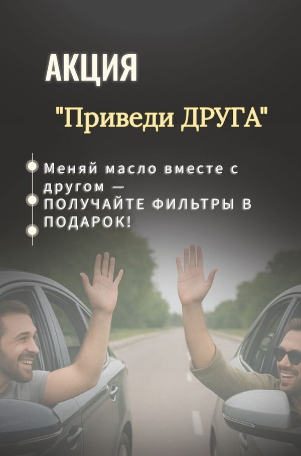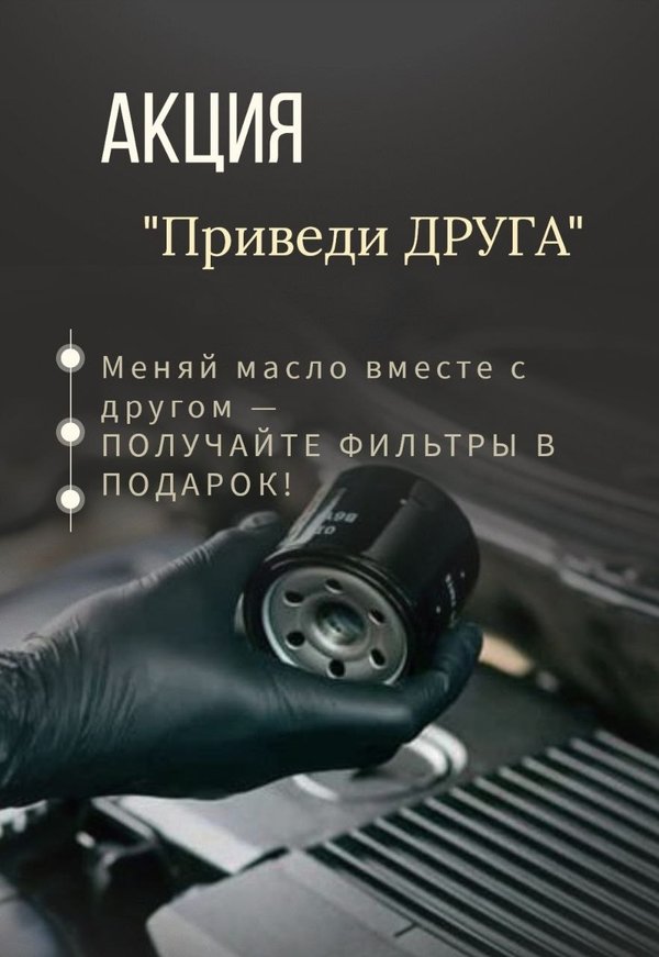 АКЦИЯ «ПРИВЕДИ ДРУГА»! Меняешь масло у нас? Получи купон на масляный фильтр в подарок для себя и ещё один — для своего друга! Забота о машине + бонус для тех, кто рядом. Успей воспользоваться! Подробности по телефону: Вы можете записаться к нам онлайн: График работы: с 09:00 до 22:00, без выходных Ждём вас Мызы 8кЗ (на территории оптового рынка) Заезд на территорию для наших клиентов всегда бесплатный (предъяви чек на кассе и мы вернём Вам деньги) ⠀