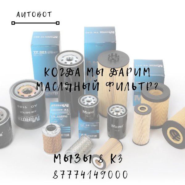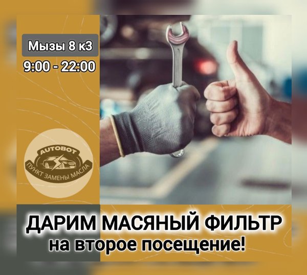 Выгодное знакомство! Посетили наш “ AUTOBOT” впервые? При следующем визите масляный фильтр будет в подарок Чтобы в следующий раз не терять время в очереди, вы можете сами записаться к нам в сервисный центр онлайн Либо по номеру телефона ⌚График работы: с 09:00 до 22:00 Мызы 8к3 (на территории оптового рынка) Въезд на территории для наших клиентов всегда бесплатный (предъяви чек на кассе и мы вернем Вам деньги)