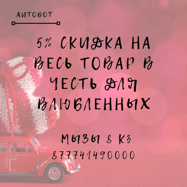 Сделай подарок своему любимому автомобилю 14 февраля! Автобот дарит 5% скидку на весь товар в день влюбленных! Ждём Вас по адресу ул.Мызы 8 к 3 (территория оптового рынка) Записаться на замену масла, антифриза, шиномонтаж