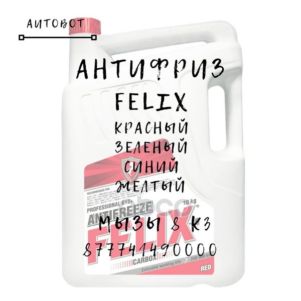 сится к классу G12+ по классификации Volkswagen, то есть может применяться на современных автомобилях после 1996 года выпуска. Изготовлен из моноэтиленгликоля, деминерализованной воды и пакета карбосиликатных органических присадок. Антифриз прошел испытания в лабораториях США на соответствие международным стандартам. Технические характеристики: ресурс — до 250 тыс. км или 5 лет эксплуатации; всесезонный — может использоваться в круглогодичном режиме; температура кипения — +110 °C; температура кристаллизации — –42 °C; режим эксплуатации — от –45 °C до +50 °C; защита помпы от кавитационной коррозии; отсутствие неорганических присадок (фосфатов, силикатов, аминов и т. д.). Производителем заявлены высокие антикоррозионные свойства антифриза и точечное воздействие на источники коррозии. Отзывы потребителей на этот антифриз, в целом, положительные. Особенно автомобилисты выделяют невысокую цену, качество самой продукции и надежность. Felix Carbox выпускается в следующем ассортименте: 1 кг, 5 кг, 10 кг. Вывод: антифриз Felix Carbox подходит для всех современных автомобилей отечественных и иностранных марок, за исключением автомобилей SAAB, Audi и Volkswagen, выпущенных после 2008 года. Ждём Вас по адресу ул.Мызы 8 к 3 (территория оптового рынка) Записаться на замену масла, антифриза, шиномонтаж