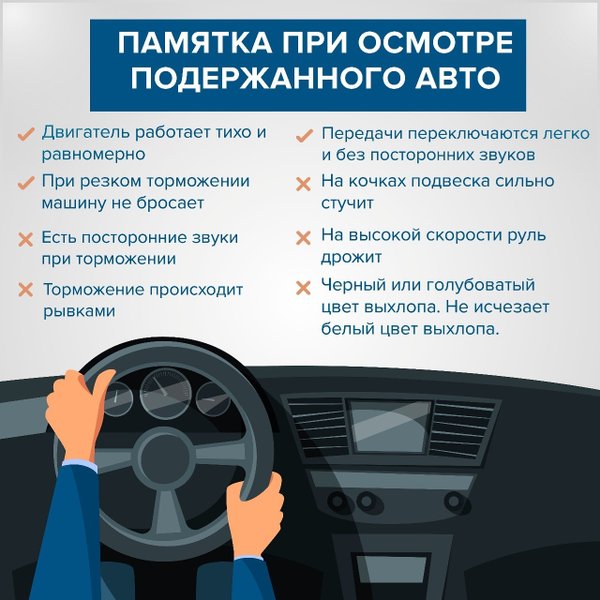 та не обойтись. Тормоза. Проверьте их сразу после начала движения. Понаблюдайте — не бросает ли машину в стороны при резком торможении, не слышны ли при этом какие-то посторонние звуки. Если торможение происходит рывками, значит проблема с колодками. Подвеска. Попробуйте поездить по мелким кочкам и послушайте, как работает подвеска. Сильные стуки должны вас насторожить. Если руль начинает дрожать на высокой скорости или при крутом повороте, то колеса, возможно, не отцентрованы или разбалансированы. Коробка передач и сцепление. Передачи должны переключаться легко и без посторонних звуков. Они также не должны срываться и выскакивать. Прислушайтесь к шуму коробки передач с выжатым и отпущенным сцеплением: если чувствуете разницу — будьте готовы к ремонту. Машину лучше проверять при дневном свете — так лучше заметны дефекты покрытия и подкраски. Покажите машину мастеру, которому вы доверяете. Не соглашайтесь на специалиста, которого советует продавец. Желаем вам удачи в покупке авто!