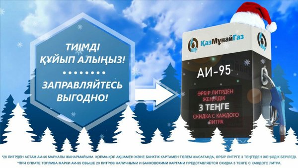 Друзья, скоро Новый год, пора скидок и подарков! Мы так же не остаемся в стороне и радуем скидками на заправках КазМунайГаз! Заправляйтесь с нами и в путь!