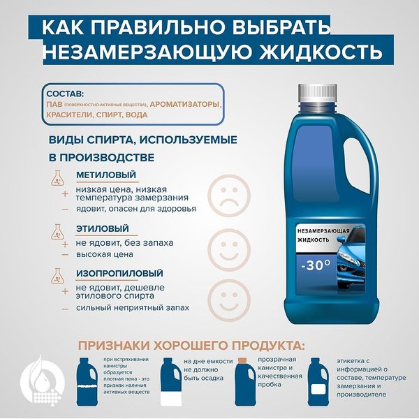 зывают у человека головную боль, а также могут привести к раздражению глаз и дыхательных путей. покупайте такой товар исключительно в специализированных магазинах, вызывающих доверие, а не на стихийных торговых точках вдоль дороги. Сохраняйте пост в закладках, чтобы в нужный момент инфографика была под рукой. А вы уже залили «незамерзайку»? Желаем вам и вашему автомобилю не мерзнуть!