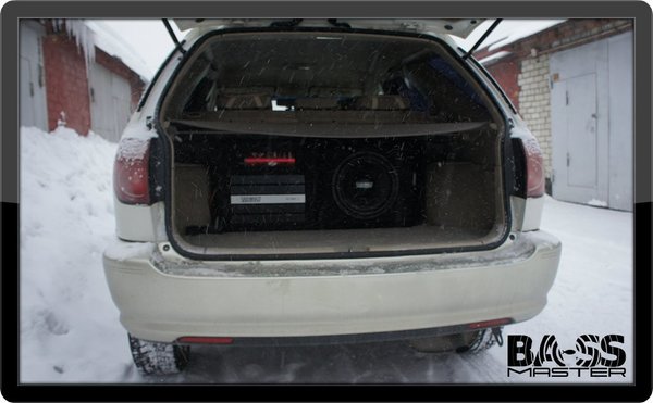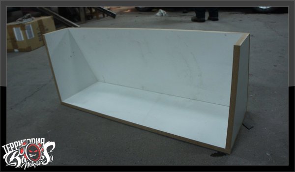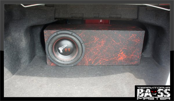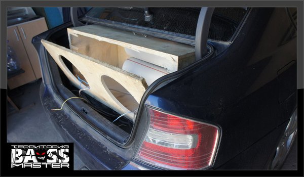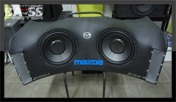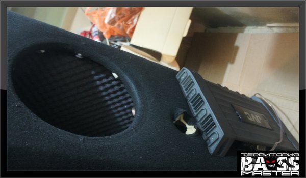ения подсветки до начала полки и равняется внешнему диаметру динамика. Короб ЗЯ, объем 20 литров, проклеенный герметоном (шумка пирамидка в народе), прикручен к задней полке (4 болта, 8 шайб, 4 гайки, 4 контршайбы — мало ли кому интересно)). Короб обтянут серым карпетом Шумофф, между коробом и металлической полкой виброизоляция 2мм — правильно, чтобы гасить вибрацию и не дребезжала полка. В декоративную полку установлена укороченная решетка гриль 12 дюймов, баса от этого меньше не стало, а вид имеет. Миниатюрный моноблок Alphard Machete MA-450.1D разместился также на полке снизу, его мощности как раз достаточно. Итого имеем: багажник не дребезжит, весь бас в салоне, провода не болтаются, ящики с моющими средствами, тряпками итд стоят под сабом, человек доволен, а я вдвойне).