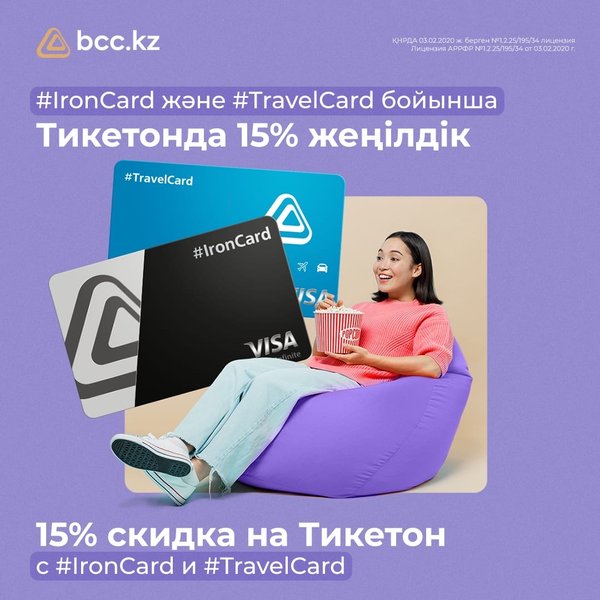 айтесь выгодой с картами нашего банка ▫️15% скидка по #IronCard и #TravelCard ▫️Максимальная сумма скидки: 3000 тенге ▫️10% скидка по #картакарта ▫️Максимальная сумма скидки: 2000 тенге Срок акции: до 31 августа 2022 года