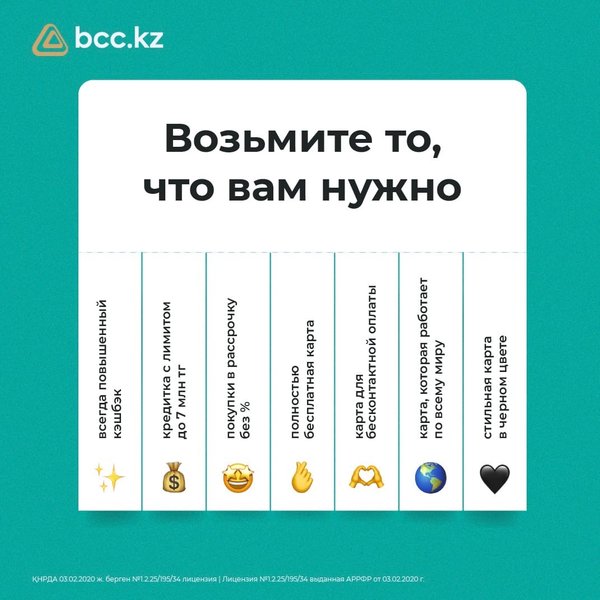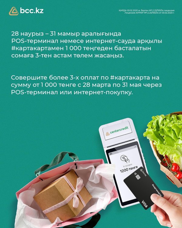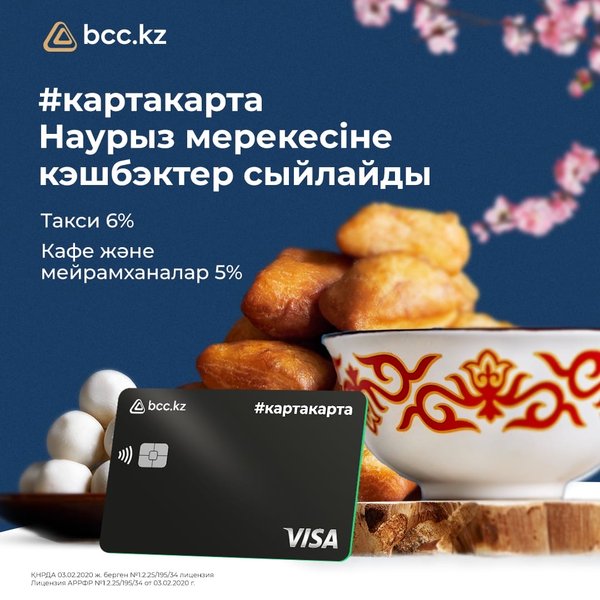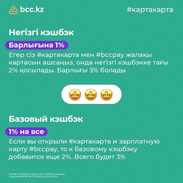 2% орнына 3% – барлығына Дәл осындай кэшбэкті енді біздің #bccpay жалақы картасын қолданатын барлық сүйікті клиенттеріміз алатын болады! Жалақы карталарын шығарып, #картакарта-ға 3% кэшбэк алыңыздар *** 3% вместо 2% – на все Именно такой кэшбэк теперь будут получать наши любимые клиенты, которые пользуются зарплатной картой #bccpay! Выпускайте зарплатные карты и зарабатывайте 3% кэшбэка к