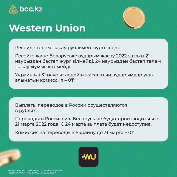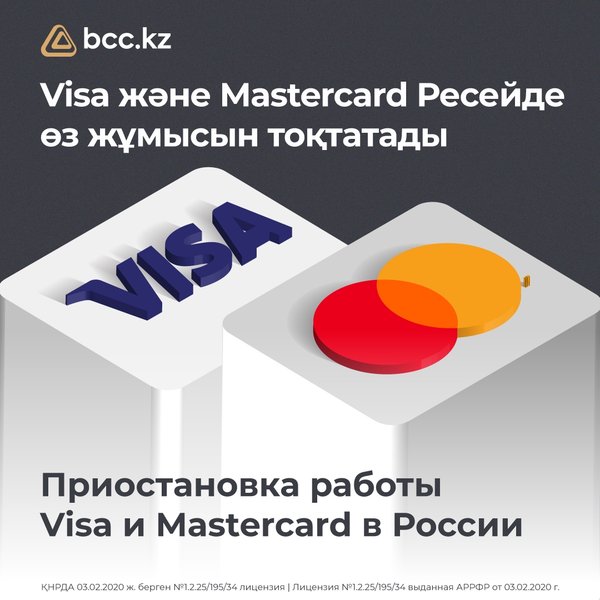 сли вам необходимо перевести деньги в Россию или из России, можно воспользоваться системами «Золотая корона» или Western Union, которые работают в штатном режиме. Вы всегда можете связаться с нами в WhatsApp: ▫для физических лиц) ▫для юридических лиц) *** Visa және Mastercard халықаралық төлем жүйелері 10 наурыздан бастап Ресейде өз жұмысын тоқтата тұратыны туралы хабарлады. Осыған байланысты Қазақстанда шығарылған карталар бойынша Ресей банктерінің карталарына және карталарынан ақша аудару, сондай-ақ Ресей аумағында қолма-қол ақша алу, қолма-қолсыз төлем жасау, интернетте сатып алу операциялары қолжетімсіз болады. ️ Кеңес: 1. Егер қазіргі сәтте Ресейде жүрген болсаңыз, біз Қазақстан банктері шығарған карталардағы ақшаны алып алуға кеңес береміз, себебі Visa төлем жүйесі кез келген сәтте өзінің Ресейдегі жұмысын тоқтатуы мүмкін. 2. Егер Сізге Ресейге немесе Ресейден ақша аудару қажет болса, «Золотая корона» немесе Western Union жүйелері арқылы аударуға болады, олар қалыпты режімде жұмыс істейді. Бізбен WhatsApp арқылы әрқашан хабарласуға болады: ▫жеке тұлғалар үшін) ▫заңды тұлғалар үшін)