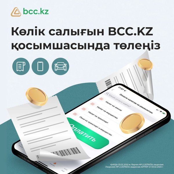 Мүлікке салынған салықты 1 қазанға дейін төлеуді ұмытпаңыз Бұған бір минут уақыт кетеді – BCC.KZ қосымшасы арқылы онлайн. Төлемдер -> Бюджетке төленетін айыппұлдар мен төлемдер -> Деректемелер бойынша салықтарды төлеу -> Мүлік салығы тарауына өтіңіз. *** Не забудьте оплатить налог на имущество до 1 октября Это займет всего минуту – онлайн в приложении BCC.KZ. Перейдите в раздел Платежи -> Штрафы и платежи в бюджет -> Оплата налогов по реквизитам -> Налог на имущество.
