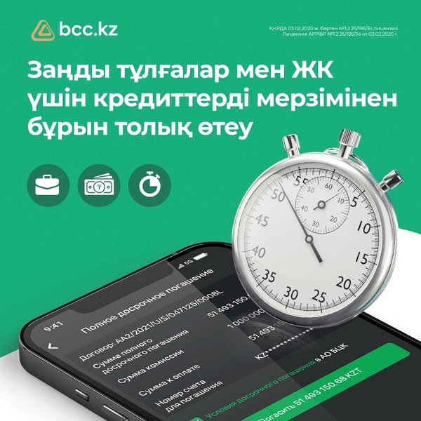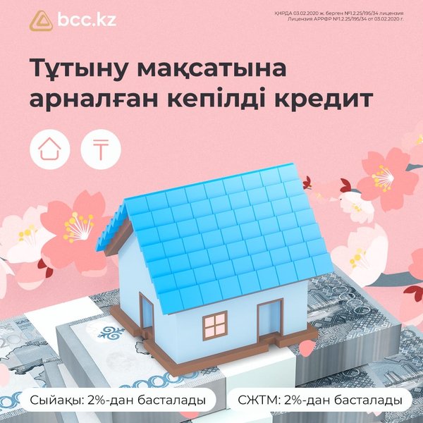 жымайтын мүлікке құқық белгілейтін және бағалау құжаттары. ▫️Мөлшерлемесі: 19,5%-дан ▫️СЖТМ: 22,6%-дан Барлық сұрақтарды 505 нөміріне мобильді телефоннан қоңырау шалу арқылы, нөмірі арқылы WhatsApp желісінде немесе комментарийде қоюға болады * * * #залоговыйкредит от нашего банка позволяет в кратчайшие сроки получить крупную сумму денег под залог жилой или коммерческой недвижимости. Для подробной консультации оставьте заявку на нашем сайте bcc.kz в разделе «Потребительское кредитование» или в любом отделении нашего банка. У нас нет комиссии за рассмотрение заявки, а кредит можно получить даже без подтверждения дохода Условия кредитования ▫️Срок: от 3 месяцев до 10 лет ▫️Сумма: до 70% от стоимости недвижимости ▫️Документы: удостоверение личности, правоустанавливающие документы и оценка на недвижимость ▫️Ставка: от 19,5% ▫️ГЭСВ: от 22,6% Все вопросы можно задать по номеру 505 с мобильного телефона, по номеру в WhatsApp или в комментариях