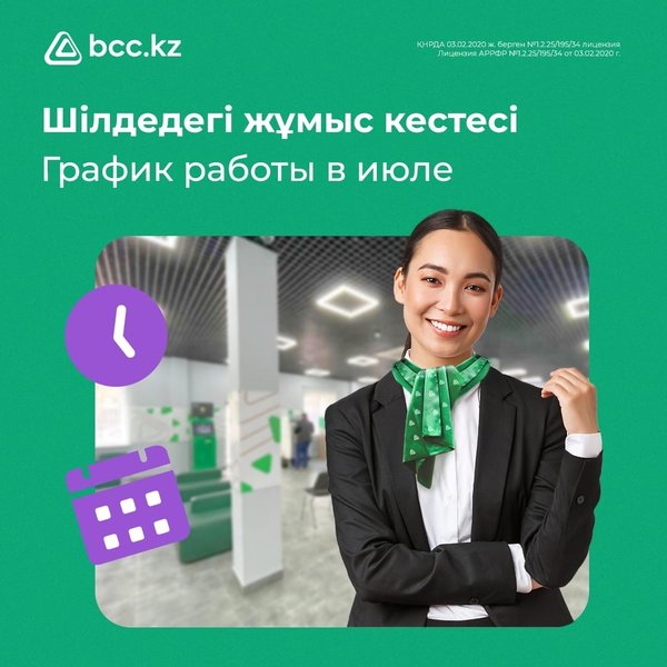 ау, 17-ықш., 95 Жаңаарқа, Абай көш., 25 Ақтөбе, Н. Шайкенов көш., 11 Қазақстан бойынша орналасқан банк бөлімшелері туралы барлық ақпаратты биодағы сілтеме арқылы bcc.kz сайтынан білуге болады. * * * Дорогие клиенты, для вашего удобства мы открыли, а также обновили отделения нашего банка в нескольких областях Казахстана: Щучинск, ул. Мухтара Ауэзова, 80 Косшы, ул. Республики, стр. 62 Нур-Султан, пр. Жеңіс, 70 Нур-Султан, пр. Мангилик Ел, 42 Алматы, мкр-н Аксай-2, 9А Усть-Каменогорск, ул. Виноградова, 18/31 Текели, ул. М.Ауэзова, 33 Талдыкорган, мкр-н Жастар, 42 Талдыкорган, ул.Абылай хана, 185 Талдыкорган, пр. Назарбаева, 68Б Капшагай, 5 мкр-н, 18а Талгар, ул. Кунаева, 83 Урджар, ул. Шынгожа Батыра, 70А Актау, мкр-н 17, 95 Жанаарка, ул. Абая, 25 Актобе, ул. Н.Шайкенова, 11 Всю информацию об отделениях банка по всему Казахстану вы можете узнать на сайте bcc.kz по ссылке в био.