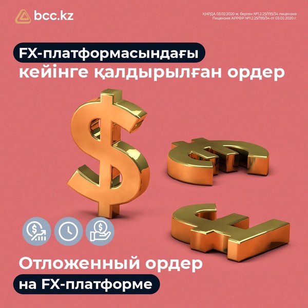 сондай-ақ есептен алынатын және аударылатын соманы көрсетіңіз Кейінге қалдырылған ордерге сұрау салыңыз *** Покупайте и продавайте валюту по подходящему вам курсу в приложении BCC.KZ Благодаря функции «Отложенный ордер» в приложении BCC.KZ вы можете покупать и продавать валюту по заданному вами курсу. Если в течение дня курс валюты достигнет указанной вами цены, покупка совершится автоматически. Чтобы воспользоваться функцией: Войдите в приложение BCC.KZ -> Переводы -> FX-платформа -> Отложенный ордер Выберите счет для списания и зачисления Укажите нужный вам курс и суммы к списанию и зачислению Запросите отложенный ордер