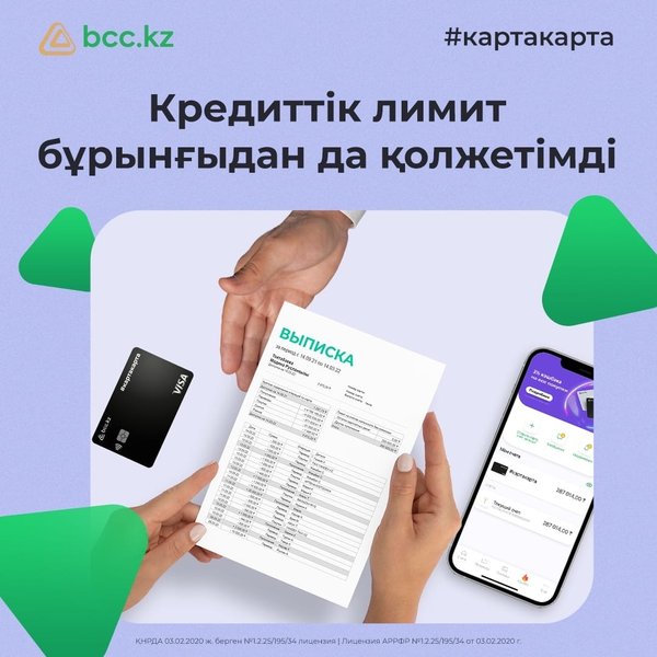 Енді #картакартаны ашу үшін cіздің жеке куәлігіңіз, смартфоныңыз бен BCC.KZ қосымшасы ғана қажет, басқа ештеңе де керек емес! Қарапайым нұсқаулықты пайдаланып, cіз ЦКБ-де шотыңыз болмаса да, мұны бірнеше минут ішінде тегін әрі онлайн жасай аласыз #картакарта ұсынатын артықшылықтар: — кез келген сауда үшін 2%-ға дейін кэшбэк — сүйікті санаттар бойынша сауда үшін 10%-ға дейін кэшбэк — серіктестер желісіндегі сауда үшін 30%-ға дейін кэшбэк — 7 миллион теңгеге дейінгі кредиттік лимит — ЦКБ серіктестерінің желісінде пайызсыз және артық төлемсіз б… — Читать дальше