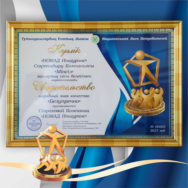 рждает, что его страховые продукты и сервис достойны народного знака качества «Безупречно». Достигается это всё за счет того, что в Компании уделяют пристальное внимание реализации системы менеджмента качества. Благодаря чему разрабатываются и выводятся на рынок конкурентоспособные страховые услуги, которые ориентированы на предоставление востребованной защиты и осуществление оперативной выплаты. Национальная лига потребителей совместно с Ассоциацией предприятий безупречного бизнеса проводит исследование рынка товаров и услуг РК и на основании полученных результатов с 2000 года ежегодно награждает лучшие компании народным знаком качества «Безупречно». Награда является символом качественных товаров и услуг, реализуемых на территории Казахстана. Страховая компания «НОМАД Иншуранс» заботясь о своих клиентах старается предоставить им как можно больше удобных и полезных сервисов. С этой целью Компания запустила для своих клиентов услугу по бесплатной юридической консультации по правам потребителей у специалистов Национальной лиги потребителей. Если Вы остались недовольны приобретенным товаром или предоставленной услугой, но не знаете, как поступить, не опускайте руки — позвоните в Национальную лигу потребителей на горячую линию. Юристы с вниманием отнесутся к волнующей Вас проблеме и предоставят консультации по дальнейшим действиям, а также помогут добиться возмещения морального и материального вреда от недобросовестных предпринимателей. Для того, чтобы получить бесплатную консультацию у опытных и компетентных юристов Национальной лиги потребителей позвоните на номер 2040 (Kcell) или на 2518 (Beeline). С мобильных телефонов звонок бесплатный.