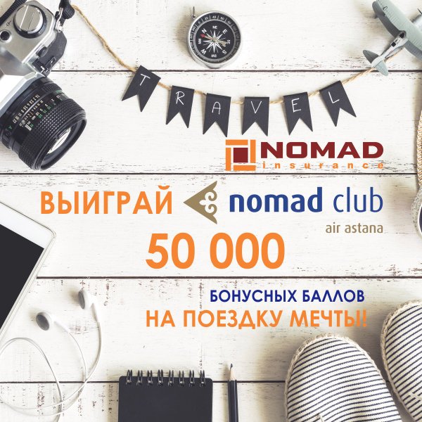 на бесплатные перелеты, либо для повышения класса обслуживания до спального эконома или до бизнес класса; — В розыгрыше 50 000 баллов принимают участие все клиенты, получившие баллы Nomad Club за оформленные страховые полисы в период действия акции; — Розыгрыш 50 000 баллов проводится посредством генератора случайных чисел. Что такое Nomad Club? Nomad Club это программа премирования частолетающих пассажиров авиакомпании Эйр Астана. Участники программы Nomad Club зарабатывают баллы за перелеты на рейсах Эйр Астана и за пользование услугами партнеров программы. Эти баллы могут быть использованы для бесплатных перелетов либо для повышения класса обслуживания до спального эконома или до бизнес класса. НОМАД Иншуранс и в дальнейшем будет радовать своих клиентов новыми акциями. За новыми акциями и новостями следите на наших страничках в социальных сетях. Подробная информация по номеру 2233 (бесплатно с мобильных телефонов) или на сайте компании