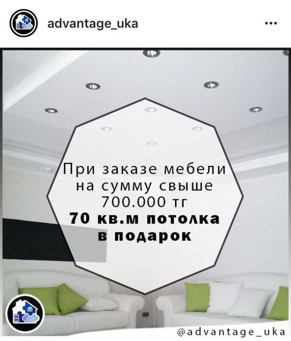 При заказе мебели на сумму свыше 700.000 тенге 70 кв.м. Натяжного потолка в подарок