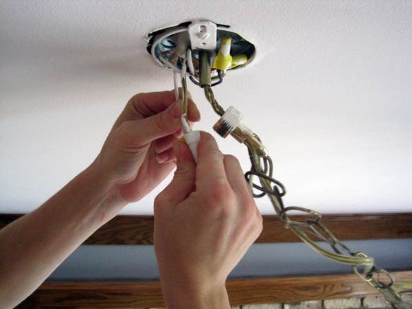 твертка-индикатор; — плоскогубцы с изолированными ручками; — кусачки; — отвертка; — изоляционная лента; — блок для зажима проводов. Подготовьте крюк, к которому будет крепиться люстра. Если ранее в помещении не был предусмотрен потолочный светильник, проделайте в центре потолка отверстие перфоратором. Оно должно быть в непосредственной близости от места выхода электрических проводов. Крюк прикрепите к потолку анкерным способом, а затем обмотайте его двумя слоями изоляционной ленты. Изучите инструкцию по монтажу, если она прилагается к люстре. Как правило, в описании светильника даются рекомендации по его установке. Если в инструкции указывается, что конструкция предполагает заземление, непременно учтите это при монтаже. Если вам это кажется сложно, вызовите электрика и он пофессионально выполнит установку. Отключите помещение от электроснабжения, используя автоматические выключатели на распределительном электрическом щитке. При включенном выключателе осторожно проверьте отверткой-индикатором отсутствие напряжения в монтируемой сети. После проверки переведите выключатель в нерабочее положение. Приступайте к монтажу. Отыщите на потолке три провода: «нулевой» и два фазных. Нейтральный провод пойдет в монтажную коробку, а фаза выводится на выключатель. С каждого провода снимите часть изоляции и разведите очищенные концы в стороны, чтобы предотвратить их случайное замыкание. Длина оголенного кончика должна быть 3—5 мм. Определите, какой провод является «нулевым», а какие – фазными. Вновь включите электричество в помещении. По очереди дотроньтесь индикатором до кончиков проводов. Загоревшийся индикатор укажет на «фазу», отсутствие свечения лампочки свидетельствует о том, что вы нашли нейтральный провод. Пометьте «нейтраль» кусочком изоляционной ленты. Установите фазность проводов светильника. Как правило, электрические люстры имеют соответствующую маркировку. Обычно три рабочих провода проложены в трубке и выведены на монтажную колодку с клеммами. Колодка впоследствии убирается под декоративный патрон светильника. При отсутствии маркировки по очереди включите в электрическую розетку два любых провода, отходящих от светильника, не дотрагиваясь при этом до третьего вывода. Когда зажжется половина ламп, пометьте включенные провода изолентой. Один из них оставьте в розетке, а на место второго установите третий провод. Если загорелась другая половина ламп, это указывает на то, что вы нашли второй фазный вывод. Провод, который во время операции оставался в розетке, будет «нулевым». Аккуратно повесьте люстру на крюк. Соедините «нулевой» провод люстры с аналогичным концом электрической сети на потолке. Соедините между собой также и фазные провода. Запрещается использовать пайку для соединения медных и алюминиевых проводов. Используйте для монтажа специальный зажимной блок. После окончания монтажа проводов установите на свое место декоративный патрон, добившись, чтобы провода и зажимной блок были скрыты. Подайте напряжение на люстру и убедитесь, что соединение сделано правильно.