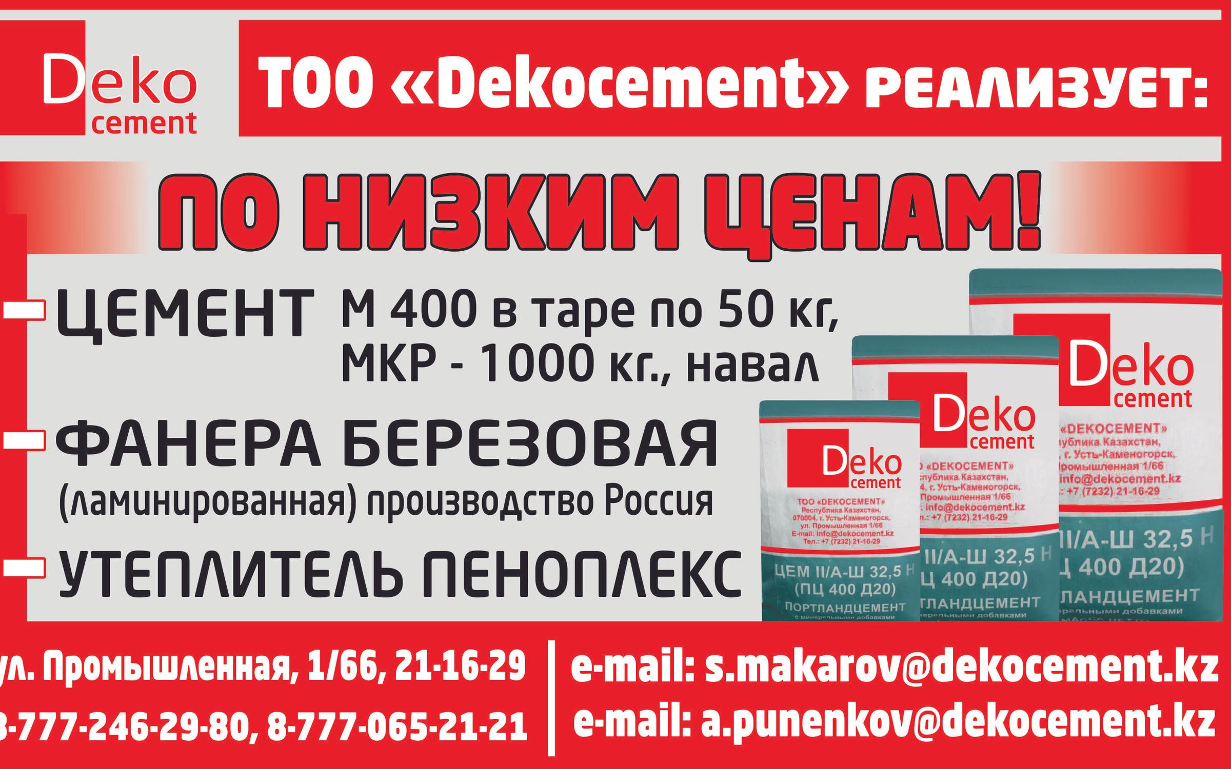 Адрес торговой компании Dekocement: Казахстан, Усть-Каменогорск, Промышленная, 1/66.