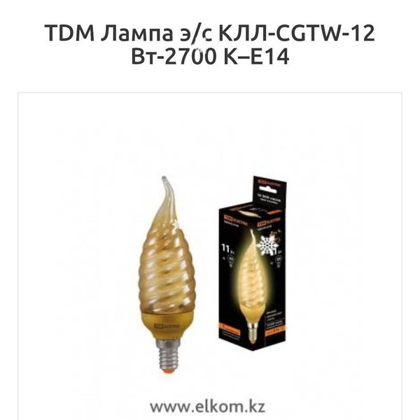 Компактная люминесцентная лампа в декоративной колбе используется для общего освещения и местной подсветки. Идеально подходят для установки в декоративных светильника, люстрах, бра. Температура колбы ниже, чем у ламп накаливания. Это позволяет использовать лампы в светильниках, критичных к повышенному нагреву. А также в светильниках с тканевыми абажурами. Цена: 1720 тг