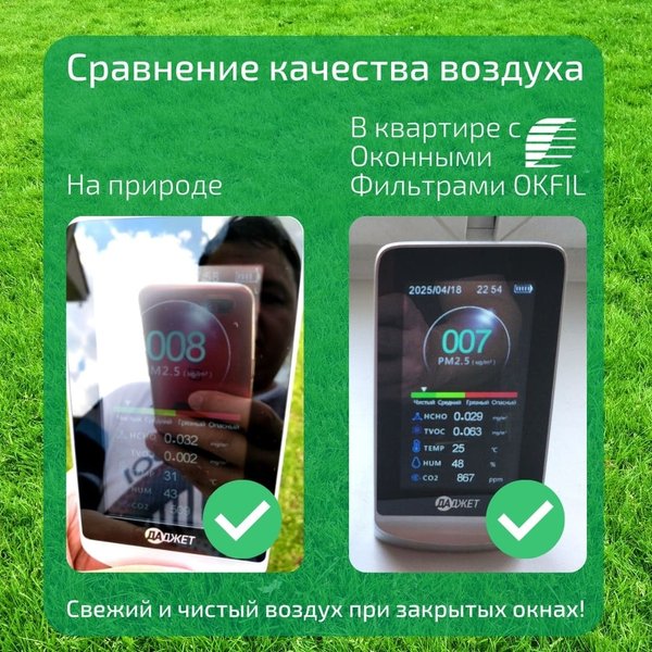 Вот, что значит правильное проветривание! Дышите свежим и чистым воздухом, благодаря Оконным Фильтрам OKFIL. По замерам с помощью специального устройства мы видим, что качество воздуха в квартире стало такое же, как на природе. Формальдегид ушёл с отработанным воздухом, углекислый газ теперь в норме, пыль и пыльца на минимуме. ▶️ Смотрите подробнее на официальном сайте оконные-фильтры.рф Сайт по франшизе okfil.biz