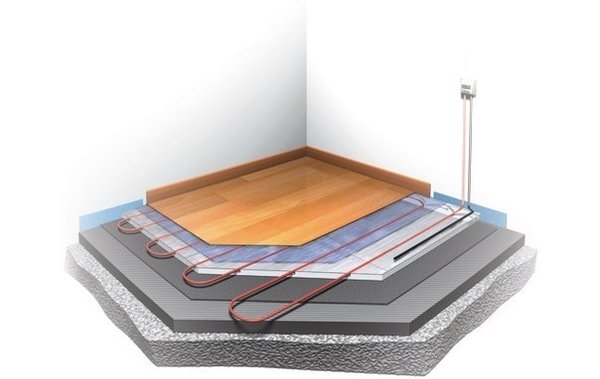 Теплый пол представляет собой нагревательный кабель (или маты), уложенные под половым покрытием.