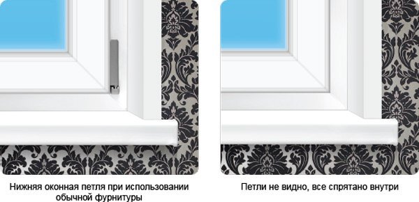 холодного воздуха в местах расположения нижней и верхней петель. Ограниченное открывание створки. Наличие ограничителя открывания створки позволяет исключить повреждение откосов створкой окна и облегчить его эксплуатацию. Фиксация положения створки при открытии под любым углом. Благодаря наличию ограничителя открывания создаётся лёгкое сопротивление при открытии створки, которая может фиксироваться под любым углом (от 0 до 100°). Обеспечение дополнительной защиты. При использовании скрытой фурнитуры повышается устойчивость окна к взлому в местах расположения петель.