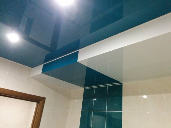 Двухуровневый потолок с прямым переходом уровня. На верхнем уровне — глянец 636. На нижнем уровне спайка глянец 156 и 303. Такой дизайн позволил дополнительно обыграть полосу тёмной плитки на стене и визуально связать стены и потолок. По периметру и на переходе уровней установлена декоративная вставка. Заказывайте потолки у профессионалов. Вызовите нашего специалиста на замер БЕСПЛАТНО!, 226—227 ЗВОНИТЕ