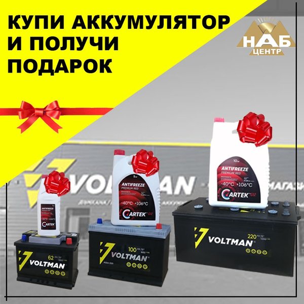 Уважаемые клиенты, с 26 октября при покупке аккумулятора вы получите антифриз CARTEK в подарок АКБ от 30 Ач до 90 Ач+ 1 литр антифриза Cartek АКБ от 100 Ач до 140 Ач+ 5 литров антифриза Cartek АКБ от 190 до 240+ 10 литров антифриза Cartek В период проведения акции дисконтные карты не действуют! Скидки не предоставляются! Города Риддер и Алтай в акции не участвуют.