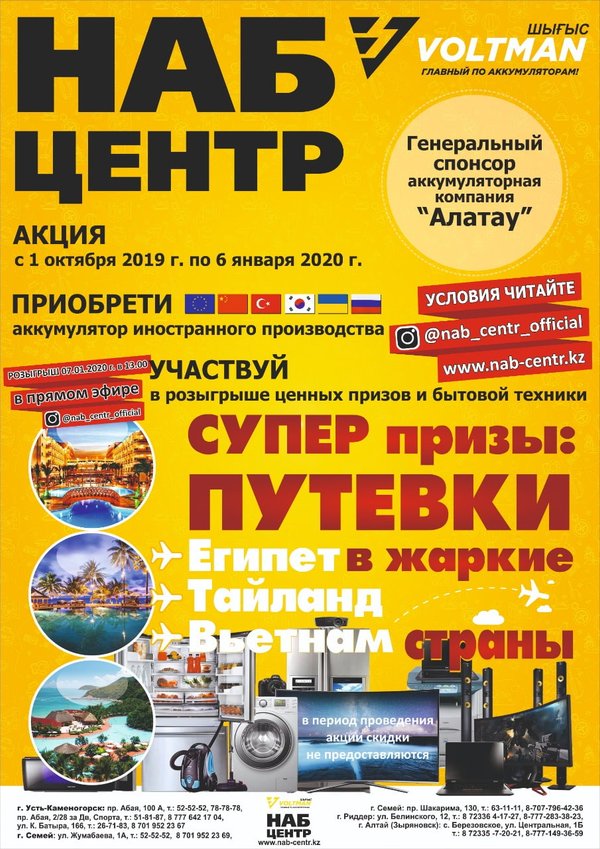 РОЗЫГРЫШ ЦЕННЫХ ПОДАРКОВ НАБ-Центр при поддержке аккумуляторной компании «АЛАТАУ» вновь радует своих клиентов масштабным розыгрышем ценных призов и бытовой техники, а также 3-х путёвок в жаркие страны Период проведения акции с 1 октября 2019 года по 6 января 2020 Обязательные условия Купить АКБ импортного производства в сети магазинов «НАБ-Центр Voltman Шығыс» Получить у продавца-консультанта лотерейный билет и опустить отрывную часть в специальную урну по сбору билетов, 2 часть сохранить у себя Быть подписчиком @nab_centr_offic… — Читать дальше