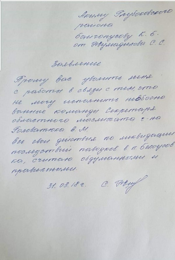 ы познакомили читателей с точкой зрения бывшего начальника отдела ЖКХ, однако отметили, что оставляем право высказать свою точку зрения акиму Глубоковского района Каликану Байгонусову и секретарю ВК областного маслихата Владимиру Головатюку, которые и подверглись критике. Руководство Глубоковского района откликнулось, и выразило с готовность высказать свою позицию по событиям паводка марта 2018 года. Свою точку зрения высказали заместитель акима Сергей Кимасов, первый заместитель председателя Глубоковского районного филиала партии Нур Отан Анна Кузнецова. — С 2009 года я работала в должности юриста в аппарате акима Глубоковского района. Я знаю Серика Сапаровича с того времени, когда он еще работал в должности заместителя акима Глубоковского района и курировал сферу ЖКХ, — рассказывает Анна Кузнецова. — Если вернуться к событиям прошлых лет, то, в то время Серику Жумадилову был объявлен строгий выговор за ослабленное руководство деятельностью служб и подготовку жилого фонда района к зимнему периоду 2011 – 2012 г., в том числе в посёлке Алтайском. Ранее Серик Сапарович работал там акимом, а уже после стал заместителем акима Глубоковского района. Выговор был объявлен 27 сентября 2011 г., а 18 октября того же года, распоряжением акима Владимира Кошелева он был уволен за ненадлежащее исполнение возложенных обязанностей. Серик Жумадилов подал в суд и сумел восстановиться в должности заместителя акима района из-за не соответствующего оформления распоряжения об увольнении. 10 апреля 2017 года проходила государственная аттестационная комиссия при областном акимате. Комиссией было принято решение о том, что Серик Жумадилов не соответствует занимаемой должности и рекомендуется к понижению. На основании заключения протокола аттестационной комиссии по Восточно-Казахстанской области 10 апреля 2017 года, а также на основании распоряжения акима района, Серик Сапарович был понижен до руководителя районного отдела ЖКХ. Вышеуказанный факт и обстоятельства дают право полагать, что Серик Жумадилов, работая на разных должностях, свои должностные обязанности исполнял не в полном объёме, а вопросы не решал комплексно и системно, — подвела итог Анна Кузнецова. А теперь о ситуации с паводками весной прошлого года. — В марте 2018 года у нас на территории Глубоковского района действительно возникла сложная ситуация, и 24 марта распоряжением акима была объявлена ЧС природного характера, — вспоминает Сергей Кимасов. — По району начались паводки. Для надлежащего руководства моим протоколом председателя комиссии по ЧС, мы составили график, утвержденный акимом района. Уполномоченные руководители всех населенных пунктов были ознакомлены с документом, в том числе и Серик Сапарович. Но он был не председателем ЧС, как он утверждает, следовательно, вмешательства в его деятельность, как руководителя ЧС, не могло быть по определению. Если говорить о давлении со стороны Владимира Головатюка, то никаких распоряжений в данной ситуации, как секретарь областного маслихата, он не давал. Потому что распоряжения давал я, как председатель комиссии по ЧС и как заместитель акима, и должностные лица нашего района, в том числе и глава района. Для предотвращения затопления поселка Белоусовка была проложена труба возле моста над рекой Гребенюшка для перелива. Если вода не 