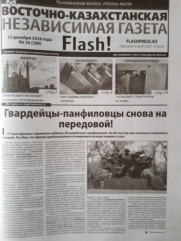 , зачем вообще воевали. Были бы в составе Германии, жили бы как бюргеры, пили баварское пиво Эта атака на героическое прошлое была необходима, чтобы легче реализовался план по развалу Советского Союза. В головах советских людей посеяли сомнения, кто-то поверил этой лжи, кто-то пребывал в состоянии шока, кто-то пытался доказывать, что это подлый обман, но в то время вся пропагандистская машина была в руках могильщиков социализма и советской страны, хотя они ещё продолжали называться коммунистами и носили в кармане пиджака партбилет. Всё это время с разных сторон нам усиленно пытались доказать, что никакого подвига 28 гвардейцев-панфиловцев не было, всё это выдумка советской пропаганды военного времени, красивая легенда военного журналиста. Но затем изменилась ситуация в самой России, которая была главным инициатором этой антисоветской кампании, осквернения памяти о Великой Отечественной войне. После присоединения Крыма у российской власти возник запрос на патриотизм. Но где его было взять? В новейшей истории есть только примеры разграбления страны и присвоения бывшей общенародной собственности, какой уж тут патриотизм, кроме «патриотизма» собственного кармана? Вот и решили российские власти прекратить обливать грязью память о войне и на военной истории развивать патриотические чувства. Только как-то избирательно они подходят к военной истории. Говорят только о народном подвиге, совершенно не упоминая о Коммунистической партии, коммунистах, социалистическом строе. Да и Советская армия оказывается без главнокомандующего, как будто и не было Сталина. На парадах 9 мая по-прежнему стыдливо закрывают фанерными щитами Мавзолей Ленина, к подножию которого в 1945 году были брошены штандарты фашистских дивизий. Но на этой волне в России вынуждены были прекратить нападки на подвиг панфиловцев. Министр культуры РФ даже назвал «мерзавцами» тех, кто подвергает сомнению этот подвиг. Вот и на днях было заявлено, что обнародованы архивные документы, абсолютно подтверждающие несомненный факт подвига 16 ноября 1941 года, когда горстка бойцов остановила фашистские танки. Конечно, точное число героев установить сложно. Может быть, их было 28, может чуть меньше, или чуть больше. Да разве это важно? Подвиг был, и на этом подвиге вдохновлялись другие герои Великой Отечественной, воспитывались последующие поколения. Интересно, что это заявление в России было сделано через несколько дней после предложения «гражданского активиста», который именует себя в Сети как Маргулан Боранбай, переименовать парк имени 28 гвардейцев-панфиловцев в Алматы в парк имени Кенесары хана. Было ли заявление в России о подлинности подвига панфиловцев реакцией на предложение Боранбая, или это простое совпадение во времени – мы не знаем. Кстати, блогер Бахытжан Копбаев на своей странице в Facebook обратил внимание, что Маргулан Боранбай был среди инициаторов переименования города Зыряновска в Алтай. Вряд ли этот факт был известен широкому кругу жителей Зыряновска, да и ВКО. Маргулан Боранбай на страницах социальных сетей нередко выступал с крайне националистическими высказываниями. Многие комментаторы недоумевают – как это ему такие высказывания сходят с рук? Куда смотрят компетентные органы? В этой связи Бахытжан Копбаев обратился к властям ВКО с предложением вернуть 