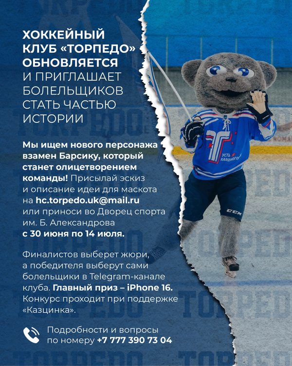 Сегодня стартовал финальный этап выбора нового талисмана команды. Напомним, компания «Казцинк» совместно с ХК «Торпедо» проводят конкурс, главным призом которого станет новенький iPhone 16 – получит его тот, чей персонаж победит в народном голосовании.