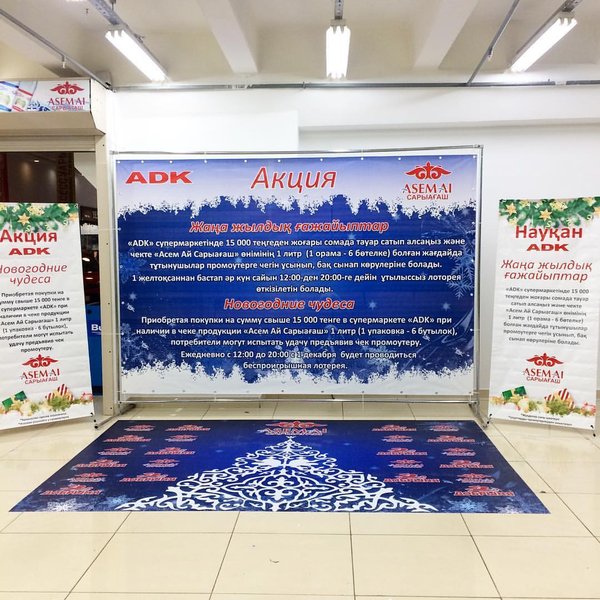 изготовление рекламной продукции для Акции в Адк Асем Ай Сарыагаш! Пресс стена, Пауки, Напольный оракал с ламинацией для износостойкости