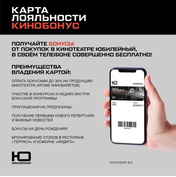 вать QR-код заведения для регистрации своего посещения. В случае, отсутствия смартфона у Вас, либо возникновения сложностей при скачивании данного мобильного приложения, возьмите с собой удостоверение и обратитесь к ответственному сотруднику кинотеатра за помощью. Он установит ваш статус по ИИН в специальном разделе приложения у себя на телефоне. Что означает ваш статус После сканирования QR-кода в мобильном приложении загорается статус посетителя в цветовом формате: Зелёный статус — посетитель обозначен в базе данных как прошедший ПЦР-тестирование с отрицательным результатом на Covid-19; (если Вы прошли тестирование не более 3-х дней назад) — вход разрешён. Синий статус — нет результатов ПЦР-тестирования, не числится как контактный — вход разрешён. Жёлтый статус — обозначен в базе данных как контактный — вход запрещен (до результатов ПЦР-тестирования). Красный статус — зарегистрирован в базе с положительным результатом на Covid-19 — вход запрещён (ждём Вас в гости после излечения) Наши любимые кинозрители, просим Вас с пониманием отнестись к ситуации и заранее скачать приложение, если Вы планируете поход в кино. Мы делаем всё возможное, чтобы Вы могли смотреть фильмы в кинотеатре «Юбилейный» вне зависимости от карантинных мер и зонирования.