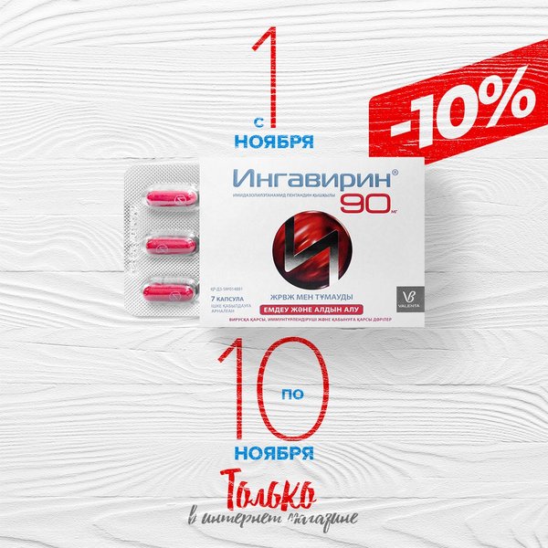 MAXI-мальная скидка! ⏰ С 1 по 10 ноября при заказе на BIOSFERA.KZ скидка -10% на Ингавирин® 90 мг № 7 капс.блист.! Ингавирин® — инновационный препарат для борьбы с гриппом и ОРВИ, способствует: Активации защитных функции организма, Снижению риска развития заболевания после контакта с человеком, зараженным гриппом и ОРВИ Сокращению продолжительности болезни Снижению риска развития осложнений Подробнее на biosfera.kz