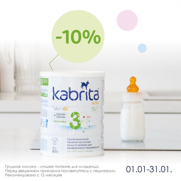 Kabrita 3 – уникальный продукт, и это проверено врачами , учеными , а главное – мамами Две порции Kabrita® 3 – это половина дневной нормы кальция для малыша Бутылочка Kabrita® 3 на ночь – это спокойная ночь мамы и малыша Kabrita® 3 – это комфортное пищеварение благодаря нежнейшему козьему молоку и уникальному жировому комплексу DigestX® Весь январь скидка -10% на Kabrita Gold 3, 800 г в сети аптек Биосфера! Грудное молоко – лучшее питание для малыша. По вопросу выбора смеси проконсультируйтесь со специалистом.
