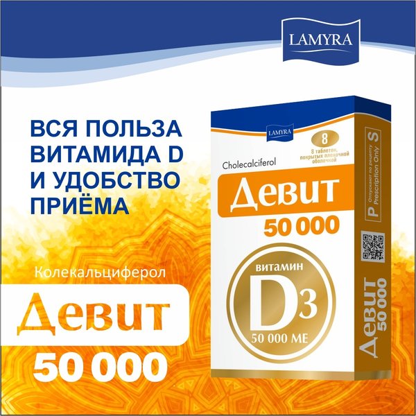 я поддержания – 1 раз в месяц. ⠀ ДЕВИТ 50 000МЕ: ⠀ 1. Быстрая и безопасная коррекция статуса витамина D. ⠀ 2. Нативная (безопасная) форма холекальциферола, которая превращается в активную форму по потребности каждого человека — когда нужно и сколько нужно. ⠀ ЛЕКАРСТВЕННОЕ СРЕДСТВО. ПЕРЕД ПРИМЕНЕНИЕМ НЕОБХОДИМО ОЗНАКОМИТСЯ С ИНСТРУКЦИЕЙ. САМОЛЕЧЕНИЕ МОЖЕТ БЫТЬ ВРЕДНЫМ ДЛЯ ВАШЕГО ЗДОРОВЬЯ Цена в сети аптек Биосфера Девит 50 000 № 8 табл.п.п.о. — 7990 тенге