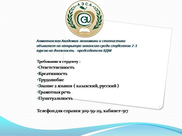 По всем вопросам обращаться к комитету по делам молодежи АЭСА 517кб. И проректору по увр Бекеновой Л.М.
