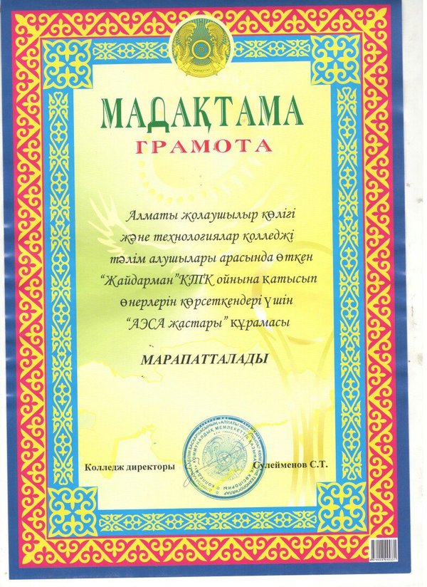 Ляззат Карсыбаева (04.04.2016): Поздравьте нас, наша академия зaслужено получила почетную и необычно тяжелую грамоту от городского акимата @akimat_almaty....большое спасибо за то что оценили нашу работу!