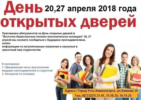 В целях ознакомления с нашим колледжом, мы проводим ДЕНЬ ОТКРЫТЫХ ДВЕРЕЙ!!! Приглашаем всех, принять участие в этом знаменательным событии! День открытых дверей будет проходить по адресу ул. Бажова 34: Контактные данные тел., 75-18-25, 55-15-25 сот. 8 705-520-91-15 20 апреля время проведения 14 00 27 апреля время проведения 14 00