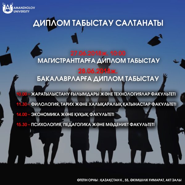 жественное вручение дипломов бакалаврам. Место и время проведения: ул. Казахстан, 55, административный корпус, актовый зал. 10.00- ФЕНиТ; 11.30 – ФИФиМО; 14.00-ФЭиП; 15.30- ФППиК.