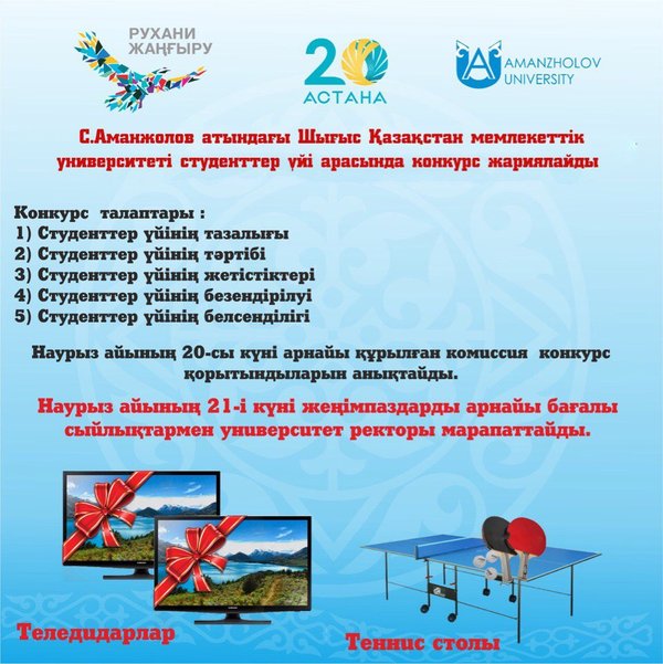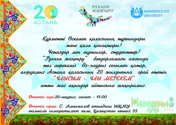 С.Аманжолов атындағы Шығыс Қазақстан мемлекеттік университетінде «Рухани жаңғыру» бағдарламасы аясында төл мерекеміз Әз-наурыз сонымен қатар, елордамыз Астана қаласының 20 жылдығына орай ұйымдастырылған » ҰЛЫСЫМ- ҰЛЫ МЕРЕКЕМ» атты жас ақындар айтысы өтті.