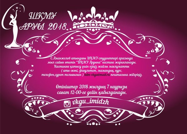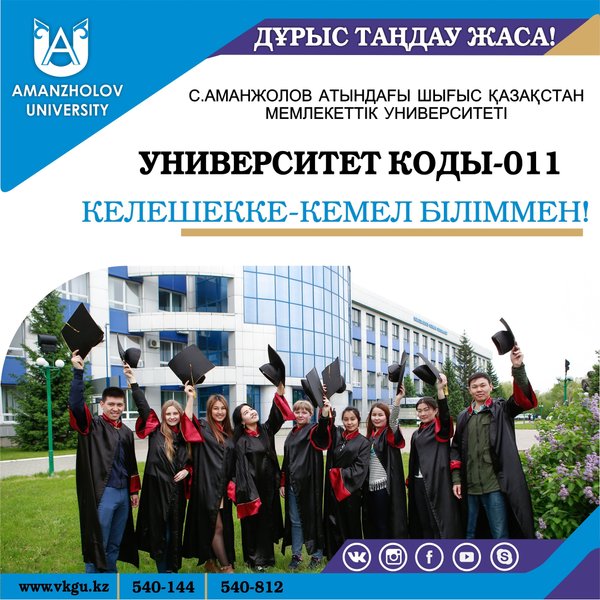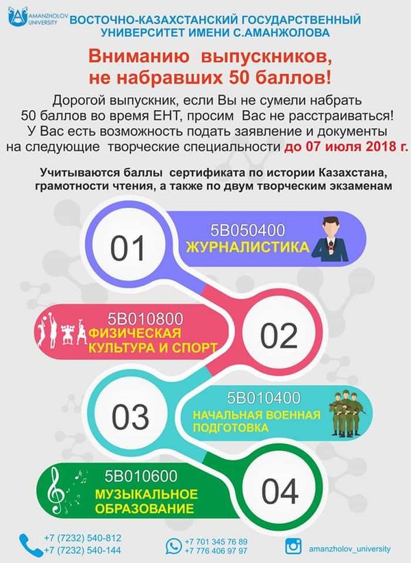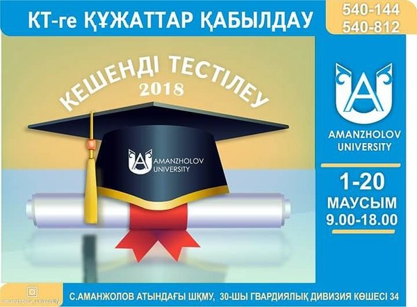 лығында, емтихандарын өткізу — 08—13 шілдеде. Барлық биылғы жылы оқуға түсуші тұлғаларға жоғарыда аталған мерзімдерді хабарлауларыңызды сұраймыз. Уважаемые родители, учителя, выпускники школ, колледжей! Приемная комиссия ВКГУ им. Аманжолова доводит до Вашего сведения информацию о том, что прием документов на комплексное тестирование на все специальности (очная (дневная), заочная, вечерняя и дистанционная формы обучения) проходит по всей стране с 01 июня по 20 июня, прием документов на творческие специальности – с 20 июня по 07 июля, проведение творческих экзаменов – с 08 июля по 13 июля, проведение тестирования с 14 июля по 18 июля! Просим довести до сведения заинтересованных лиц о вышеуказанных датах, чтобы они смогли успеть сдать документы в необходимые сроки и не опоздали в 2018 году в выборе своей будущей специальности.