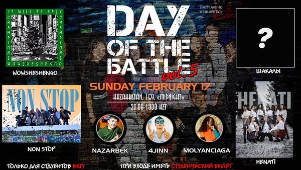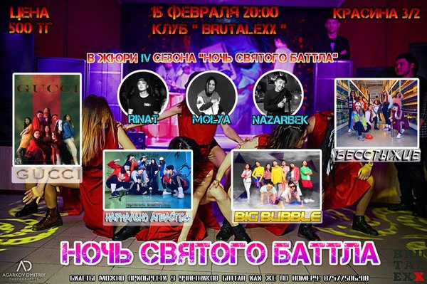 15 февраля, в ночном клубе ''BRUTALEXX'', состоится главное танцевальное событие года ''НОЧЬ СВЯТОГО БАТТЛА'' Вас ждет танцевальный баттл 4-х команд в состав которых входят студенты разных факультетов, собранных в команды по жеребьевке! Которые будут биться за главный денежный приз. А также вас ждёт умопомрачительный интерактив со зрителями! Ты просто должен придти и увидеть это всё своими глазами!
