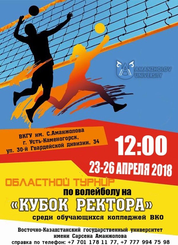 23—26 сәуір күндері С.Аманжолов атындағы Шығыс Қазақстан мемлекеттік университетінің № 1 ғимараты спорт залында Шығыс Қазақстан облысының арнаулы орта білім беретін оқу орнындары арасында волейболдан С.Аманжолов атындағы Шығыс Қазақстан мемлекеттік университеті ректорының кубогынан жарыс өтеді.