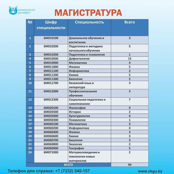 далеко не все вузы, а только лучшие такие как ВКГУ имени С.Аманжолова. Во-вторых, как правило, для проведения занятий в магистратуру приглашаются лучшие преподаватели, профессора из зарубежных вузов, специалисты, обладающие не только учеными степенями, но и практическим опытом работы. В-третьих, магистерские программы реализуются с учетом индивидуальных потребностей учащихся. Зачастую вузы предоставляют возможность выбрать график и форму обучения. В-четвертых, по итогам обучения присваивается степень магистра, которая понятна и признана за рубежом. Мобильность на рынке труда, в том числе и международная, постоянно возрастает, поэтому котируемость диплома становится важной проблемой. В-пятых, только магистратура (не бакалавриат) открывает двери в докторантуру. ‼Согласно приказу МОН РК, в котором содержится перечень грантов в разрезе специальностей по магистратуре, на все специальности сферы образования выделили 99 грантов на ВКГУ имени С.Аманжолова.‼ Приглашаем всех молодых и амбициозных желающих к поступлению в магистратуру в ВКГУ им.С.Аманжолова по самым востребованным программам обучения! Окончив магистратуру наш Университет, Вы обеспечите как свое, так и будущее Ваших близких. ️ ️