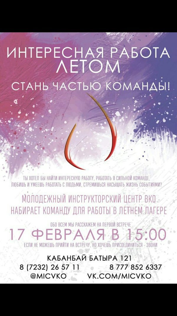 Жаз мезгілінде өз облысында құрылыс жасақтарында жұмыс істегісі келетін студенттерді нөміріне хабарласуларын сұраймыз. Жазылу мезгілі 10.04.19ж. дейін. В летний период студентам, желающим работать в строительных отрядах в своей области, просим обращаться по телефону. Дата подписки 10.04.19