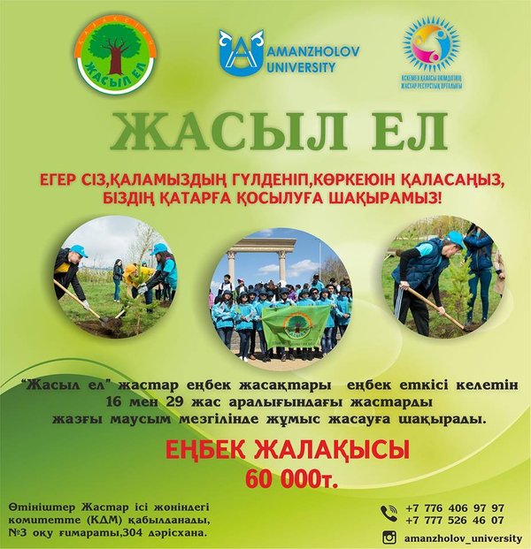 ЕГЕР СІЗ,ҚАЛАМЫЗДЫҢ ГҮЛДЕНІП,КӨРКЕЮІН ҚАЛАСАҢЫЗ, БІЗДІҢ ҚАТАРҒА ҚОСЫЛУҒА ШАҚЫРАМЫЗ! “Жасыл ел” жастар еңбек жасақтары еңбек еткісі келетін 16 мен 29 жас аралығындағы жастарды жазғы маусым мезгілінде жұмыс жасауға шақырады. Өтініштер Жастар ісі жөніндегі комитетте (КДМ) қабылданады, № 3 оқу ғимараты,304 дәрісхана. Байланыс телефондары ____________________________________________ Молодежно-трудовые отряды «Жасыл Ел» приглашают молодых людей от 16 до 29 лет работать в летний сезон. Заявки принимаются в Комитете по делам молодежи(КДМ) 3 корпус В… — Читать дальше