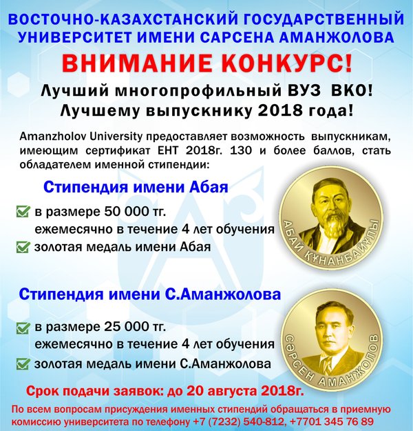 Внимание конкурс! Лучший многопрофильный ВУЗ ВКО! Лучшему выпускнику 2018 года! Amanzholov University предоставляет возможность выпускникам, имеющим сертификат ЕНТ 2018 г. 130 и более баллов, стать обладателем именной стипендии: 1) Стипендия имени Абая в размере 50 000 тг., ежемесячно в течение 4 лет обучения; золотая медаль имени Абая; 2) Стипендия имени С.Аманжолова в размере 25 000 тг., ежемесячно в течение 4 лет обучения; золотая медаль имени С.Аманжолова; Срок подачи заявок: до 20 августа 2018 г. По всем вопросам присуждения именных стипенди… — Читать дальше